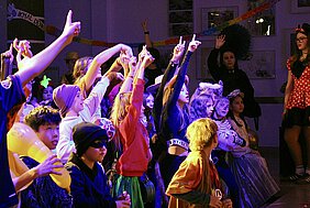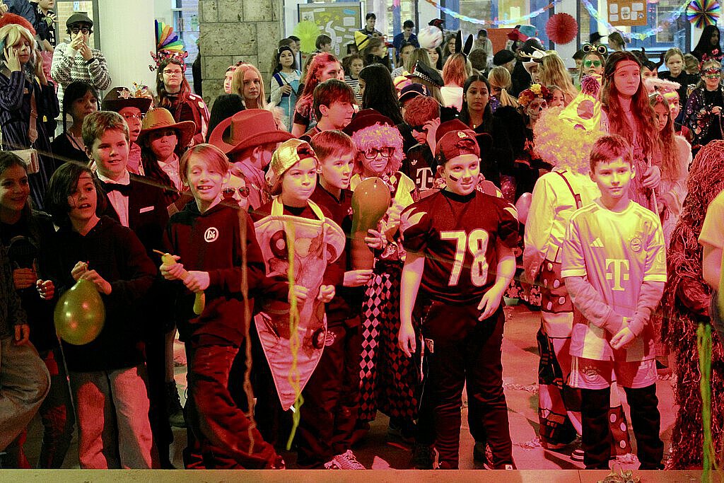 Das Aufbauen am Nachmittag hat sich gelohnt. Die 20 Tutorinnen und Tutoren verwandelten die Aula mit viel Deko in ein echtes Faschingsparadies, und dank des Technikteams schallte Musik aus den Lautsprechern, während bunte Lichter den Raum erhellten.