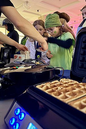Weiter ging es mit lustigen Spielen wie Schokokusswettessen, Limbo, „Schnüre essen“ oder Stopptanz. Dabei durften immer wieder einige Kinder auf die Bühne kommen und sich im Wettbewerb beweisen. Zwischendurch wurde zu den größten Hits getanzt, und eine riesige Polonaise schlängelte sich über die Partyfläche. Da das irgendwann anstrengend wird, gab es zur Stärkung Hotdogs, Waffeln und Krapfen. In einer Ruhezone konnte man sich außerdem erholen.