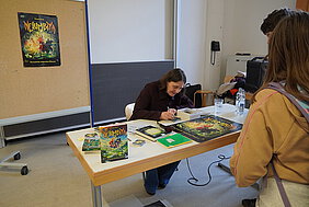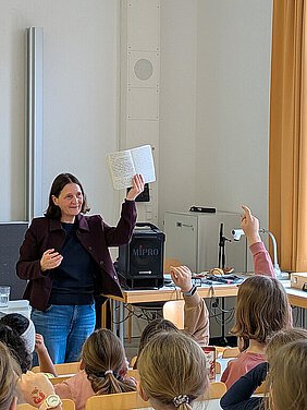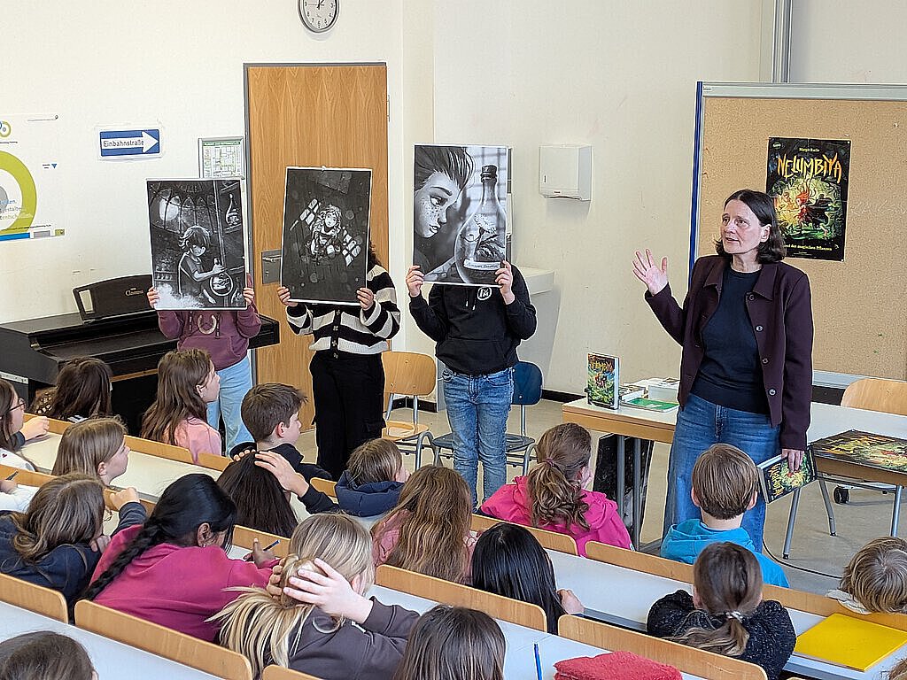 Am Ende beantwortete die Autorin noch ausführlich die vorbereiteten Fragen der Zehn- und Elfjährigen. Sie erfuhren, dass „Nelumbiya“ ursprünglich als Filmprojekt geplant war und bereits die Entwicklung der Weltkarte und ihrer Zusammenhänge ungefähr ein Jahr in Anspruch nahm. Schriftstellerisch tätig war Frau Ruile schon zu Schulzeiten. Als Schülerin verfasste sie unter anderem eine Internatsgeschichte. Das handgeschriebene Heftchen brachte sie zur Ansicht mit. Im Alter von 40 Jahren veröffentlichte die gebürtige Augsburgerin, die zunächst an der Hochschule für Fernsehen und Film studierte und dort später auch dozierte, ihr erstes Buch und ist seither hauptberuflich als Kinder- und Jugendbuchautorin in München tätig. Als Schriftstellerin gefällt es ihr besonders gut, Welten zu erfinden, die es vorher noch nicht gab und diese dann in ihren Büchern und Lesungen einem Publikum zugänglich zu machen. Das Schreiben von Geschichten vergleicht die Autorin mit einem Schneeball: Erst sei er ganz klein, dann forme sich das Ganze langsam. Generell sei die Schriftstellerei ganz schön mühsam: „Stellt euch vor, ihr müsst jeden Tag einen Aufsatz schreiben“. Die Kinder erkennen sofort Parallelen zu ihrem Deutschunterricht, in dem das Erfinden und Überarbeiten von Geschichten ebenfalls viel Geduld und Kreativität verlangt. Neben fantastischen Geschichten schreibt Ruile auch Science Fiction und behandelt Themen wie Überwachung und KI (z.B. „Dark Noise“). Aktuell arbeitet die Autorin an ihrem 11. Buch und auch für einen dritten Band von „Nelumbiya“ hätte sie Ideen. Abschließend konnten sich die Fünftklässler noch Autogrammkarten signieren lassen. Das Angebot einer Sammelbestellung von „Nelumbiya“ nahmen viele lesefreudige Kinder dankend an und freuen sich auf ein Paket von Frau Ruile mit persönlich gewidmeten Exemplaren. Die Veranstaltung wurde von Bayern liest e. V. unterstützt.