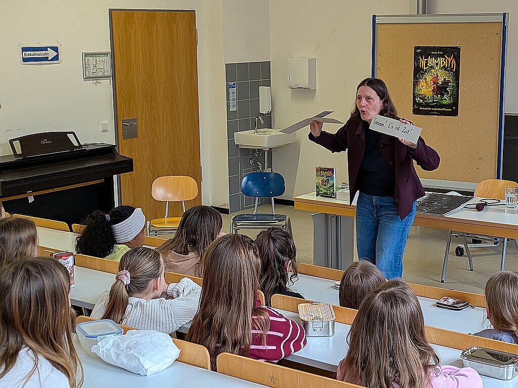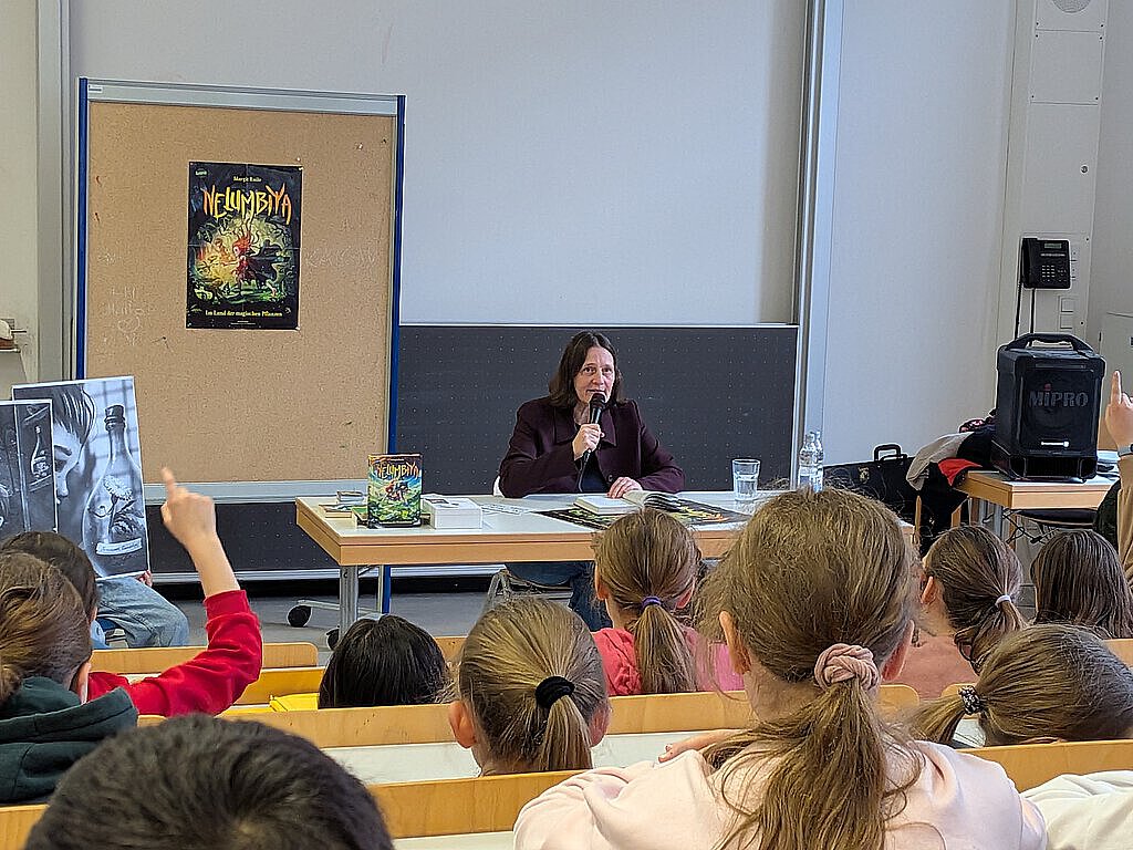 Am Donnerstag, den 26.2.2026, war Margit Ruile zu Gast am Karl-Ritter-von-Frisch Gymnasium. In zwei Lesungen stellte sie den insgesamt 142 Fünftklässlern den ersten Band ihrer zweiteiligen fantastischen Abenteuerroman-Reihe „Nelumbiya“ vor. Gleich zu Beginn holte die Autorin die Zehn- und Elfjährigen in ihrer Lebenswelt ab. Sie erkundigte sich nach Lieblings- und Kletterbäumen der Kinder und sofort wurden Erlebnisse mit Ahorn-, Linden- und Apfelbäumen in heimischen Gärten ausgetauscht. Genau hier knüpfte Frau Ruile an und stellte den sprechenden Baum Quercus vor, mit dem ihre Geschichte „Nelumbiya“ beginnt. Ein Schüler präsentierte die Illustration des uralten Eichenbaums und es wurden Mutmaßungen angestellt, wie der Baum wohl sprechen könne. Anschließend lud die Autorin zu einem Experiment ein, damit sich die Schüler die besondere Art und Weise des Sprechens vorstellen konnten: „Ich bin der Wind und ihr seid die Blätter“. Die erste Passage aus dem Romananfang wurde gelesen und die Fünftklässler direkt mit einbezogen. Sie schlüpften in die Rolle der raschelnden Blätter und eine magische Stimmung entstand, als die ganze Gruppe auf ein Windgeräusch von Frau Ruile gemeinsam, ganz leise, an den entsprechenden Stellen „Tameran! Wach auf! Es ist Zeit! Die Nacht ist vorbei! Lange vorbei!“ wisperten und den berühmten alten Pflanzenmagier so weckten. Schließlich durften die Kinder durch Pusten dem kleinen Löwenzahn Dandelion Starthilfe geben, der sich, verwandelt in Pusteblumenschirmchen, hoch durch die Lüfte auf seine abenteuerliche Reise in Richtung der Menschenstadt Ornata machte. Als Bote von Quercus und Tameran beauftragt, soll er dort die Pfeilträgerin Tara ausfindig machen und nach Nelumbiya bringen, da sie in großer Gefahr ist.