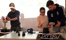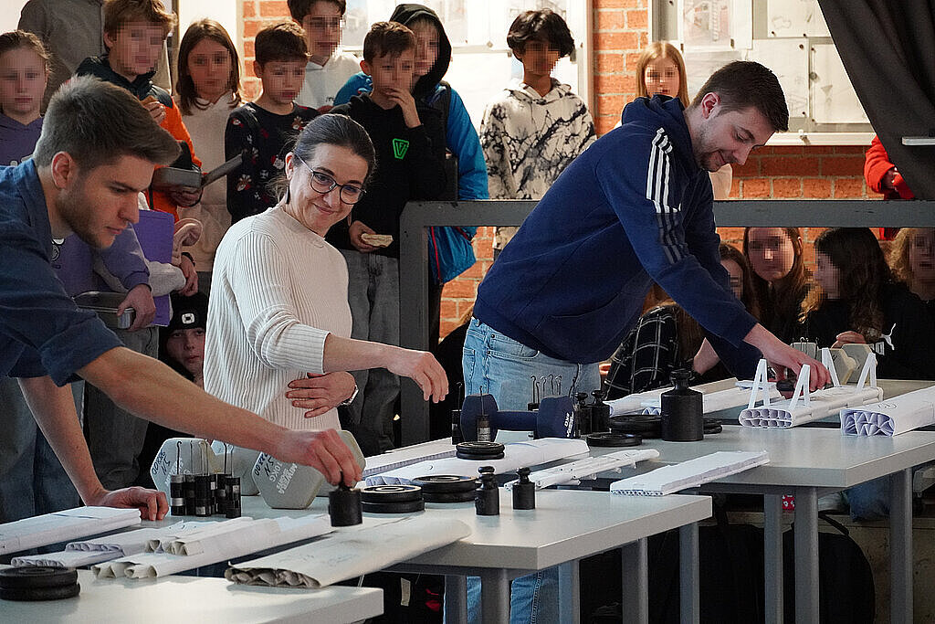 Die Bauwerke wurden von Frau und Herr Koslow, Herrn Vorderobermeier und Herrn Kelbel vor gespanntem Publikum auf ihre Belastbarkeit getestet, und die Schüler bewiesen ihre Ingenieursfähigkeiten, indem ihre Konstruktionen immer höheren Traglasten standhielten.