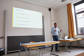 Wie Projektarbeit in einem Unternehmen abläuft, warum Projektmanagement wichtig ist und was bei einem guten Projektmanagement berücksichtigt werden muss, erfuhren die Schülerinnen und Schüler der 11. Klasse am 9. Oktober aus erster Hand: Alexander Miodek, Director Standards & Process Mobile Robots bei Jungheinrich, gab eine aufschlussreiche Einführung in das Projektmanagement. Aufgrund seiner eigenen Erfahrung konnte er den Schüler:innen wertvolle Anregungen u.a. zu Zielsetzung, Ablauf- und Terminplanung oder Projektsteuerung geben. Dem erfolgreichen Verlauf der Projekte sollte somit der Weg geebnet sein.