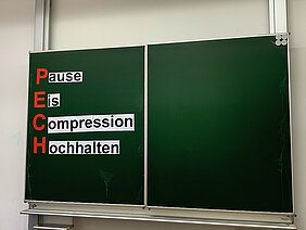 Nach anfänglichen – auch theoretischen – Grundlagen ging es im Kurs dann über das Thema „Wunden und Verbände“ auch relativ schnell in die Praxis, bevor das Ganze in der – Gott sei Dank selten geforderten – Herz-Lungen-Wiederbelebung (kurz: HLW) gipfelte und die Schüler*innen ihre in den Schulsani-Übungsstunden erworbenen Fähigkeiten hierbei überprüfen und ausbauen konnten.