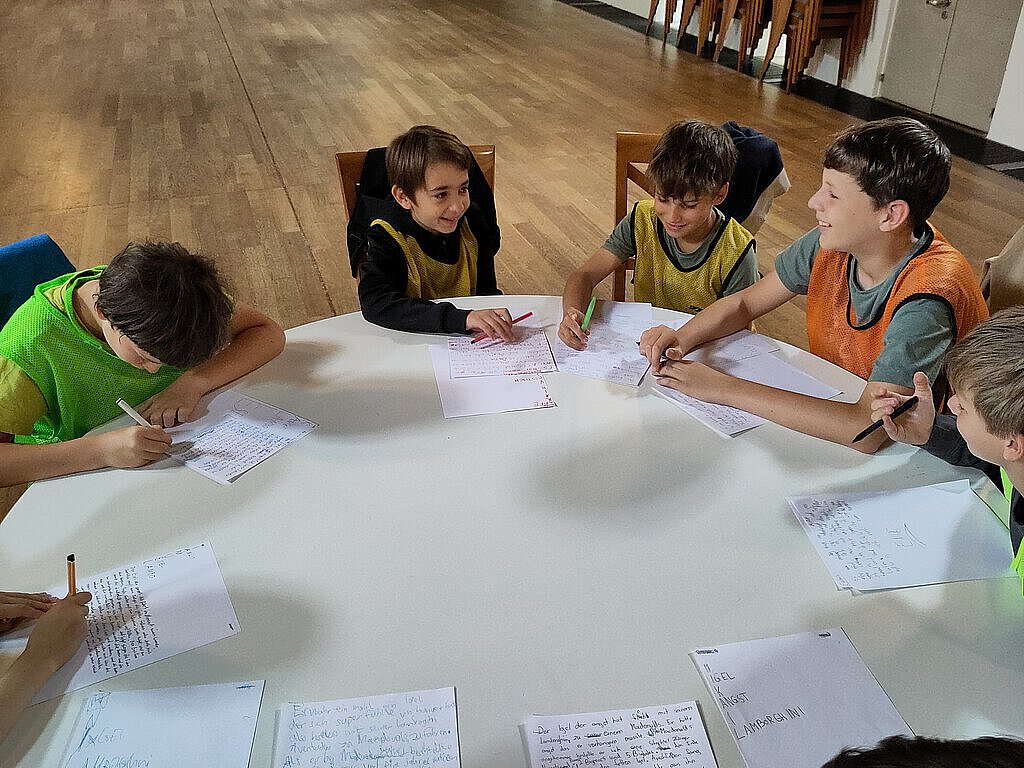 Der gesamte Vormittag in der Blutenburg wurde unter der Leitung der Journalistin Kaya Godart sehr abwechslungsreich und spannend gestaltet. Zuerst sollten sich die einzelnen Schülerinnen und Schüler drei verschiedene Begriffe überlegen und haben dann eigene kleine Kurzgeschichten verfasst, in denen diese Wörter vorkommen mussten.