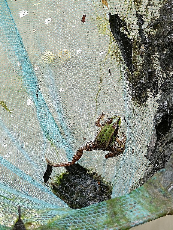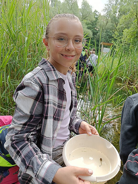 Als Erstes durften wir mit Keschern kleine Tierchen aus einem Teich herausfischen und sie anschließend in mit Wasser befüllten Schalen betrachten und bestimmen. Viele der Schülerinnen und Schüler fanden ganz unterschiedliche Tiere, wie zum Beispiel Kaulquappen, Libellenlarven, Wasserschnecken und einen Grasfrosch. Diese Tiere sind sehr wichtig, denn sie gehören zu den biotischen Umweltfaktoren und bilden mit den abiotischen Umweltfaktoren (Temperatur, Sonnenlicht etc.) das Ökosystem Gewässer.