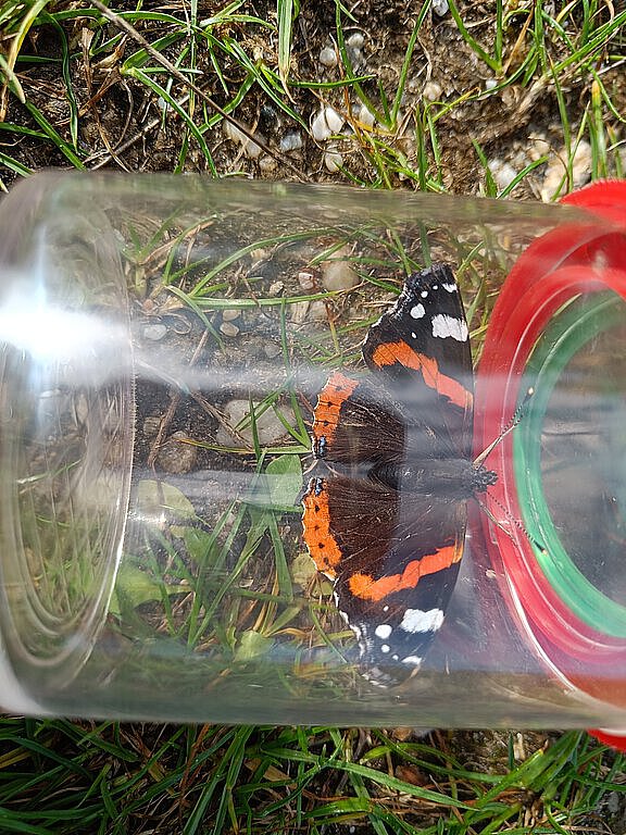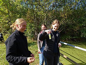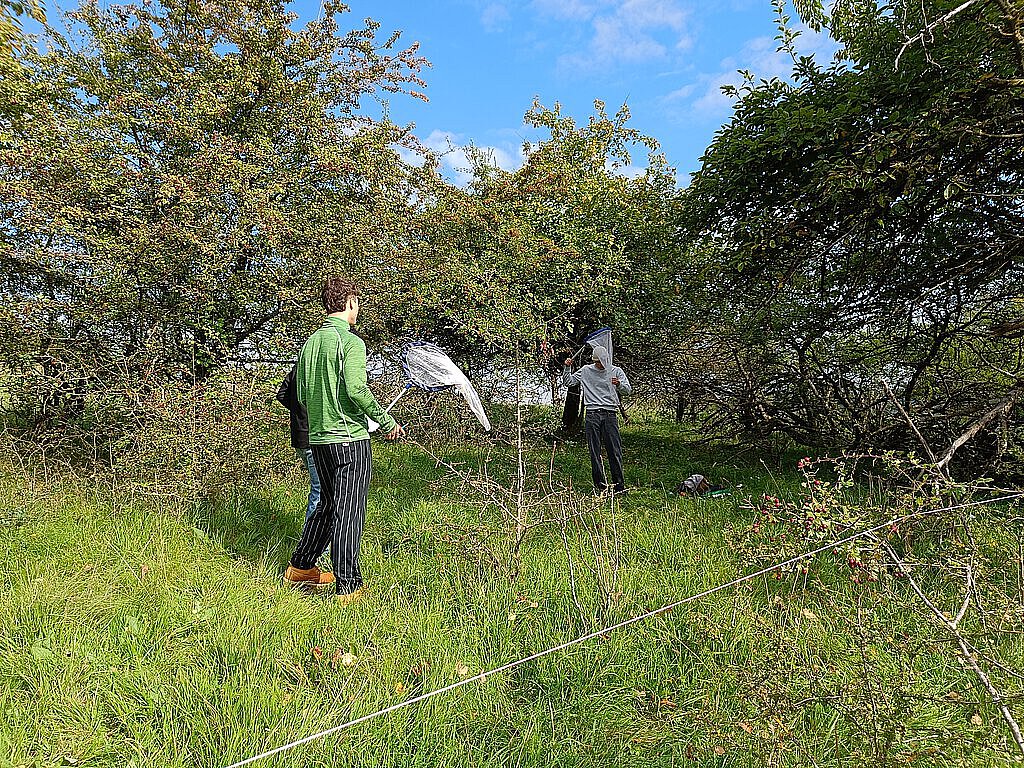 Den Auftakt bildeten am Morgen die sogenannten Barberfallen, die wir vergruben, um die Artenvielfalt der am Boden lebenden Insekten zu erfassen. Anschließend begannen wir unseren ersten Rundgang. Mithilfe verschiedener Apps bestimmten wir Vögel anhand ihres Gesangs und nahmen die Vegetation auf. Hierfür steckten wir in kleinen Gruppen je ein 10m×10m großes Untersuchungsfeld ab und untersuchten dies anschließend gründlich. Mit Bestimmungsbüchern und dem Internet gelang es uns, zahlreiche Pflanzen und Tiere zu identifizieren. Diese Informationen halfen uns, das Biotop später mithilfe von Bioindikatoren zu charakterisieren.