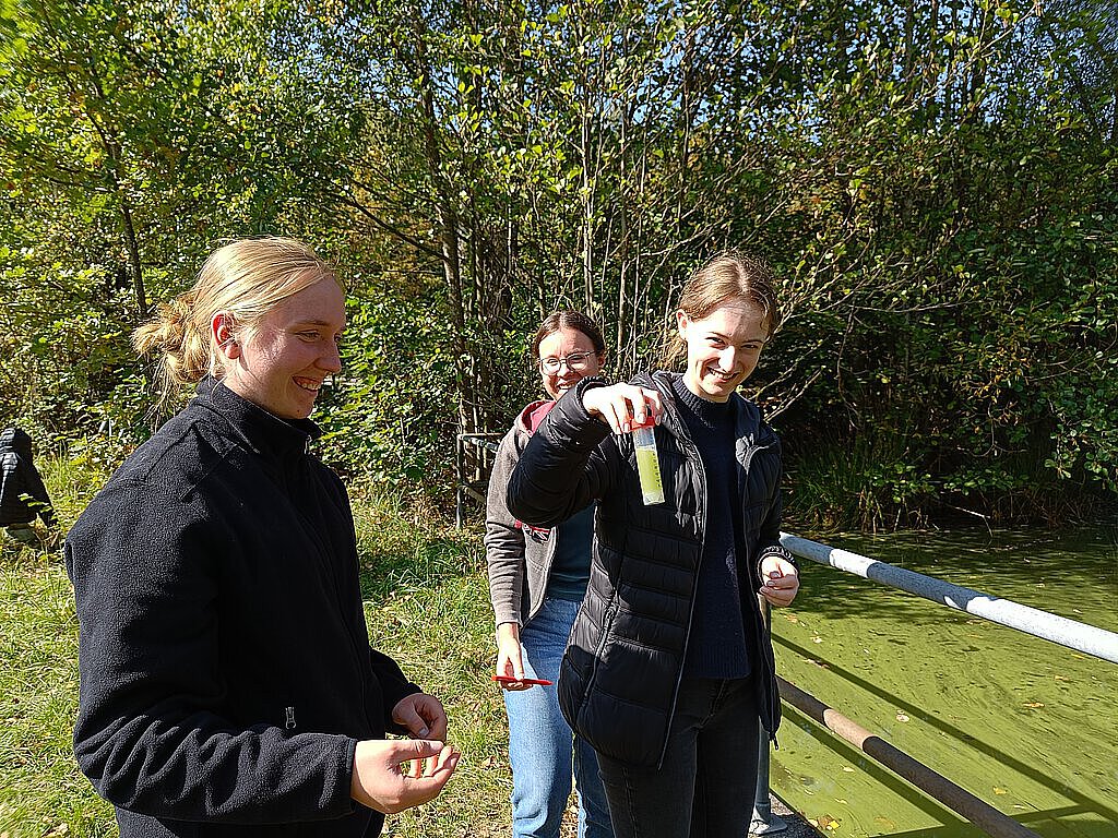 Nach einer Pause bei bestem Wetter am Parkplatz ging es an den zweiten Teil der Exkursion. Dieser fand an zwei künstlich angelegten Auffangbecken statt, die früher für die Waschanlage von Panzern genutzt worden waren. Zunächst untersuchten wir das Wasser nach einfachen Parametern wie Geruch, Färbung und Trübung, bevor wir uns mit Sichttiefe, Wasserbewegung und Temperatur beschäftigten. Der wohl spannendste Teil war die chemische Analyse. Mit Tiefensonden und Wasserproben bestimmten wir unter anderem den Sauerstoffgehalt und Ionen wie Nitrat und Ammonium. Unter dem Mikroskop betrachteten wir Kleinstlebewesen – ein besonderes Highlight war der sichtbare Herzschlag einer Mückenlarve. Zum Abschluss werteten wir die Barberfallen aus. Nach sechs Stunden war die Ausbeute leider gering, vermutlich war es schon zu kalt für die Tiere oder die Auswahl des Standortes war ungünstig.